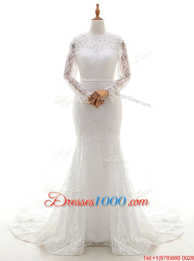 Mermaid Scalloped White Zipper Wedding Gowns Lace Long Sleeves With Brush Train
