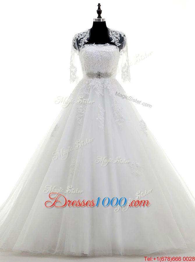 Strapless Sleeveless Tulle Wedding Dress Beading and Lace and Appliques Brush Train Lace Up