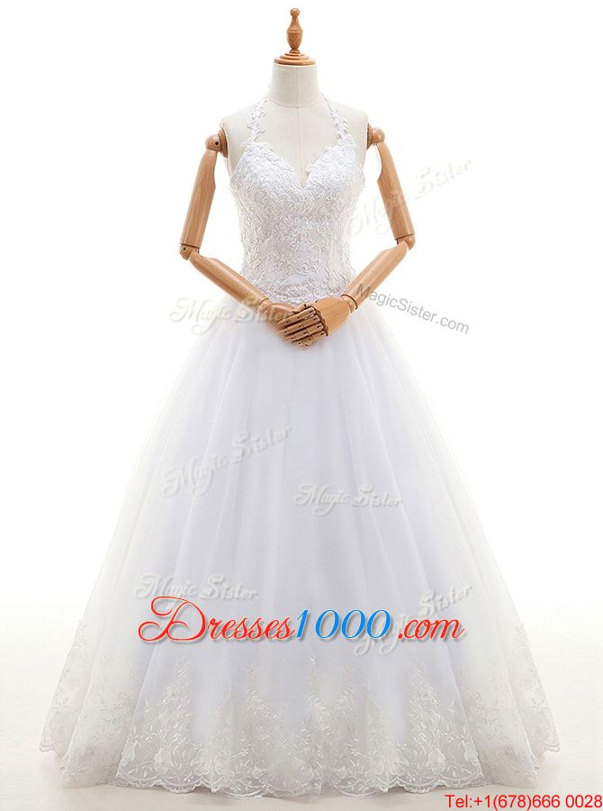 Halter Top Sleeveless Organza Floor Length Lace Up Wedding Dress in White for with Lace and Appliques