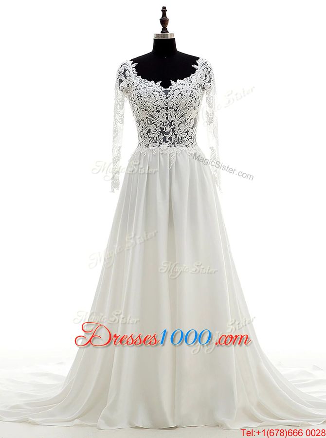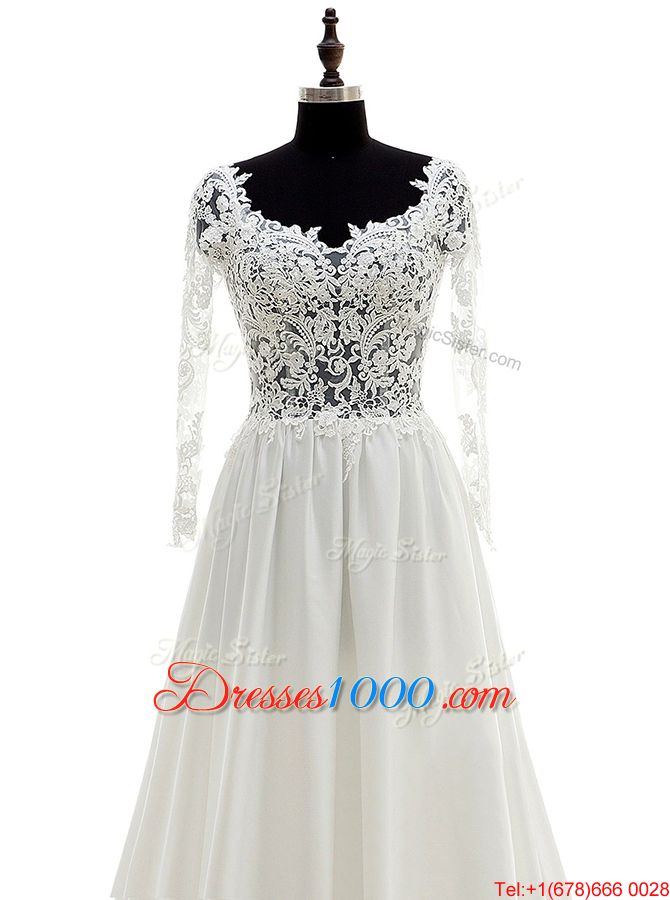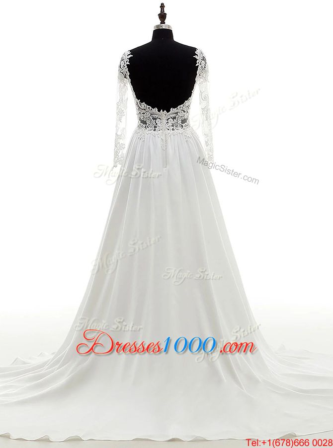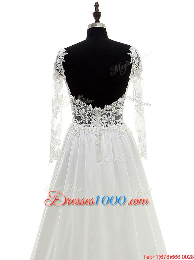 White Satin Backless Scoop Long Sleeves With Train Wedding Gowns Brush Train Lace