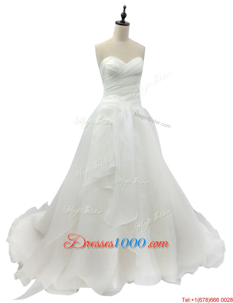 White Organza Zipper Wedding Gown Sleeveless With Brush Train Ruching