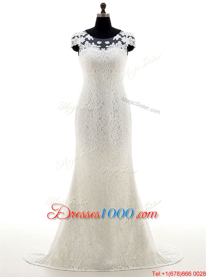 White Scoop Zipper Lace Wedding Dress Brush Train Cap Sleeves