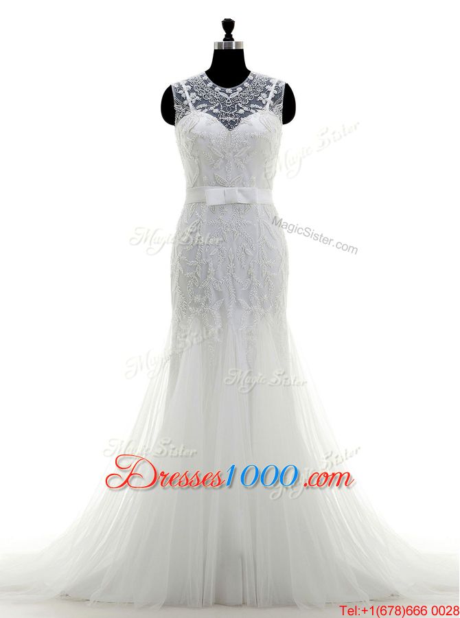 White A-line Lace and Appliques Wedding Dress Clasp Handle Tulle Sleeveless With Train