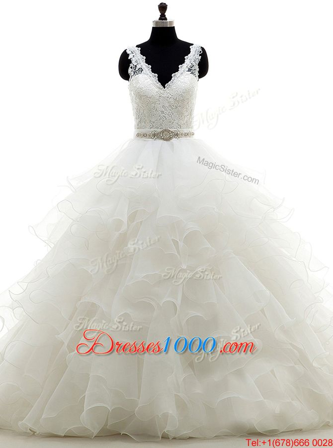 Extravagant White Ball Gowns Beading and Lace and Ruffles Wedding Gowns Backless Organza Sleeveless With Train