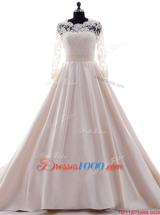 Colorful Scalloped Pink 3|4 Length Sleeve Satin Brush Train Clasp Handle Wedding Dress for Wedding Party