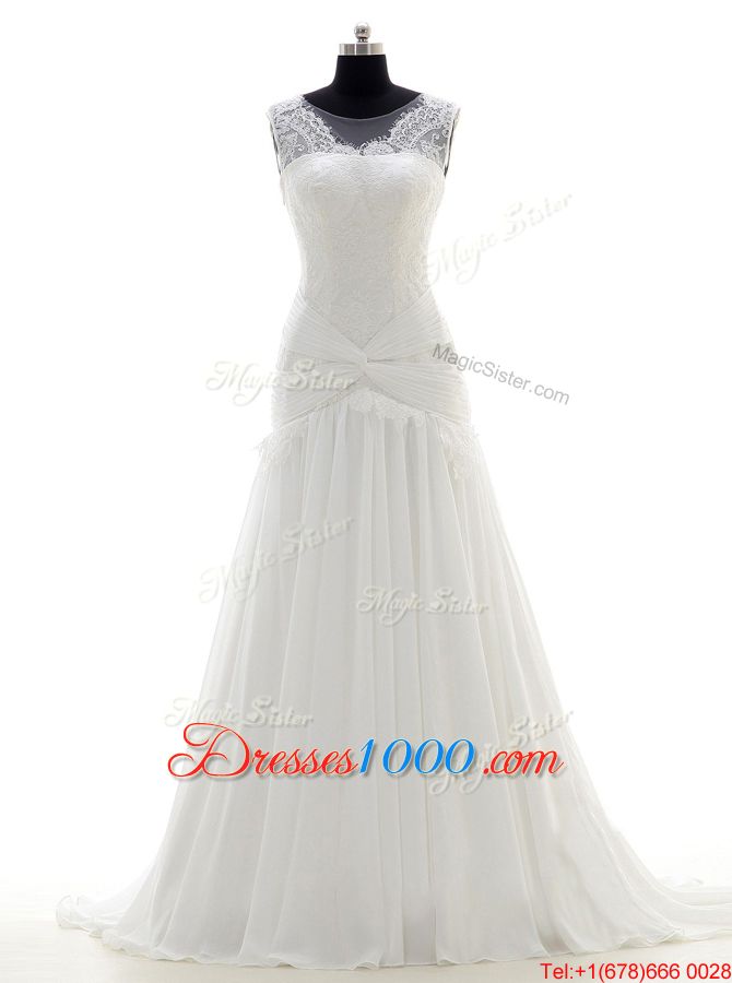 Scoop With Train White Bridal Gown Chiffon Brush Train Sleeveless Lace