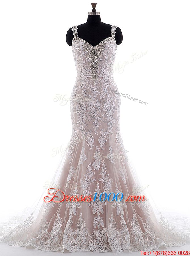 With Train Backless Wedding Gowns White and In for Wedding Party with Beading and Lace Brush Train
