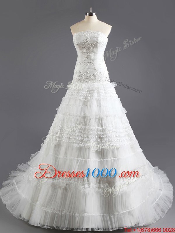 Most Popular With Train White Wedding Dresses Organza Court Train Sleeveless Beading and Appliques and Ruffled Layers