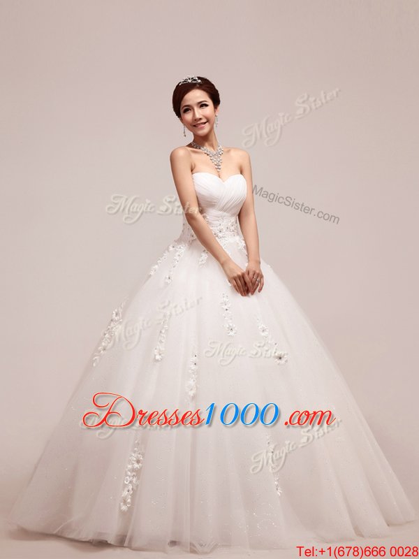 Affordable Tulle Sleeveless Floor Length Bridal Gown and Appliques and Ruching and Hand Made Flower