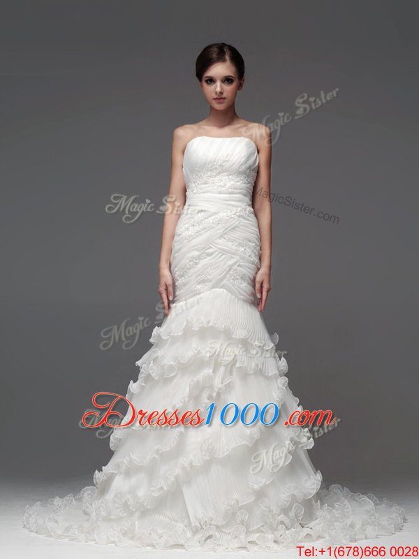 Adorable Mermaid White Organza Lace Up Wedding Gowns Sleeveless With Brush Train Ruffled Layers