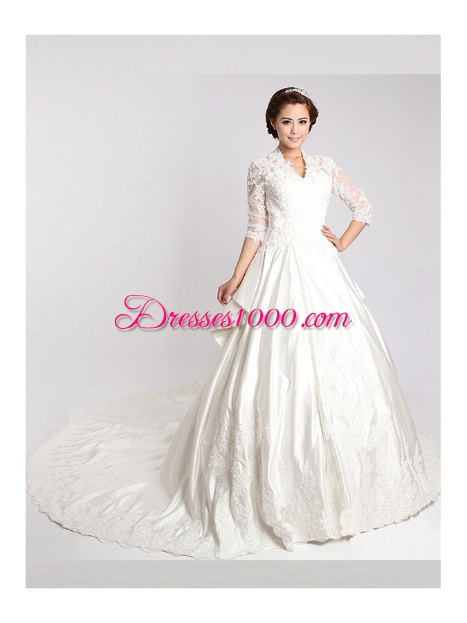 V-neck 3|4 Length Sleeve Cathedral Train Clasp Handle Wedding Dresses White Chiffon