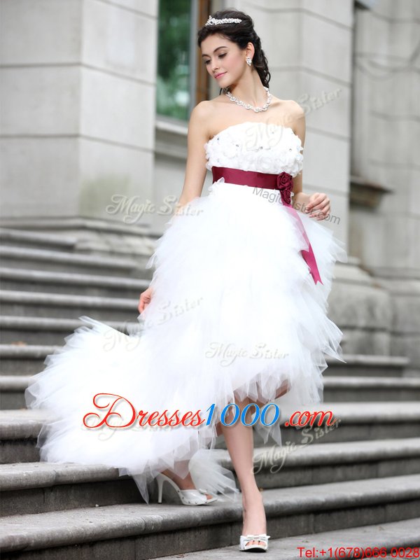 Organza Sleeveless High Low Wedding Gowns and Ruffles and Belt and Hand Made Flower