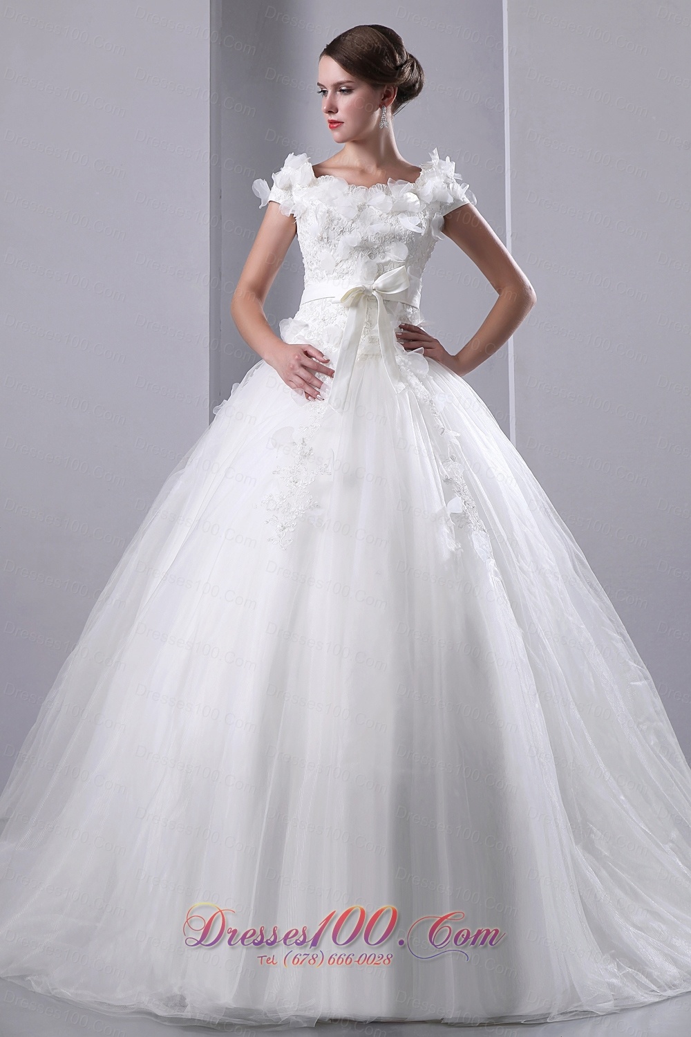 You will look a pricess when you wear this wedding gown. The bodice features short sleeves . A single dainty bow adorns the mid-section of the dress without detracting from its overall beauty. The full length skirt falls from the body-hugging waist in tiers with a bustle effect. You will be the belle of the ball in this glittering gown.