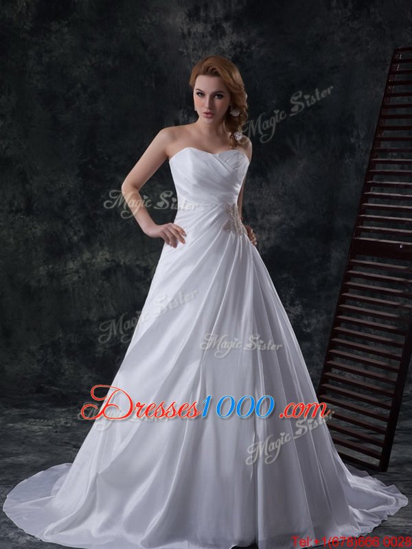 Customized White Lace Up Wedding Gowns Ruching Sleeveless Brush Train