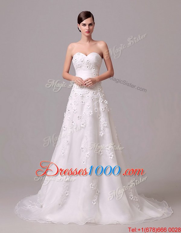 Unique With Train White Wedding Dress Sweetheart Sleeveless Brush Train Lace Up