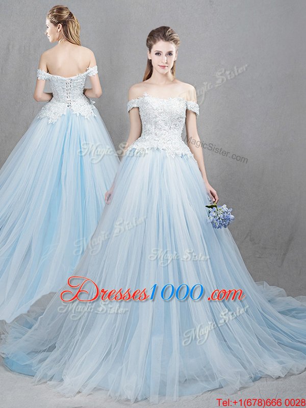 Off the Shoulder Sleeveless Chapel Train Appliques Lace Up Bridal Gown