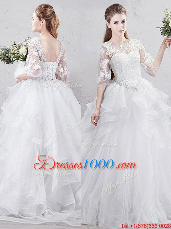 New Style Tulle Scoop Half Sleeves Brush Train Lace Up Lace and Ruffles Wedding Gowns in White