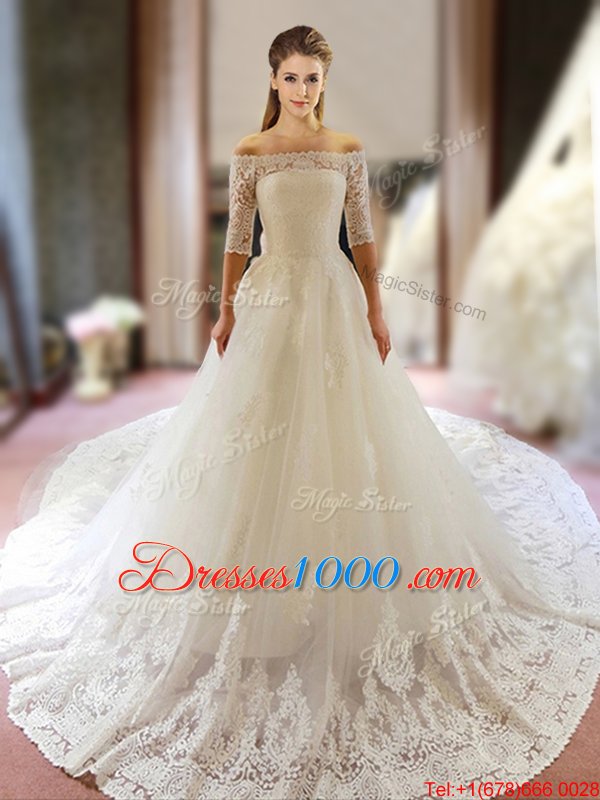 White Zipper Off The Shoulder Lace and Appliques Wedding Dresses Tulle Half Sleeves Chapel Train