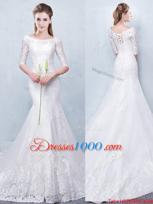 Shining Mermaid White Scoop Lace Up Lace Wedding Gown Court Train Half Sleeves
