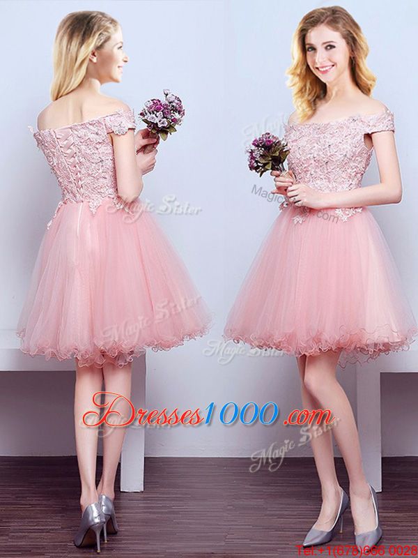 Off the Shoulder Pink Sleeveless Mini Length Beading and Lace Lace Up Vestidos de Damas