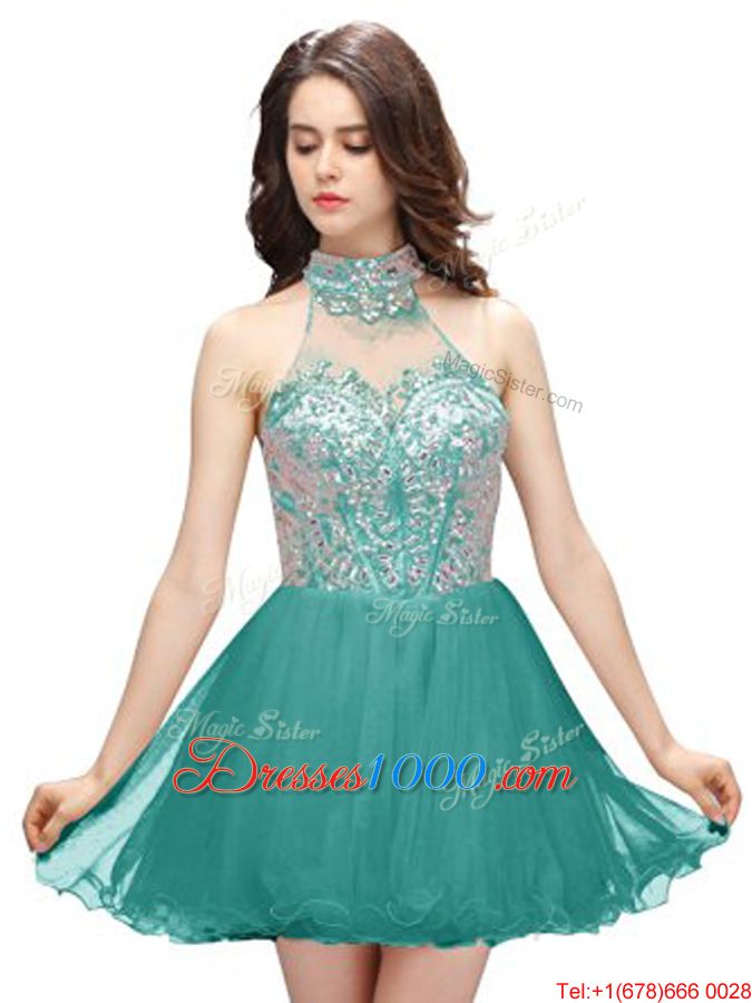 Captivating Teal Sleeveless Beading Mini Length Evening Gowns