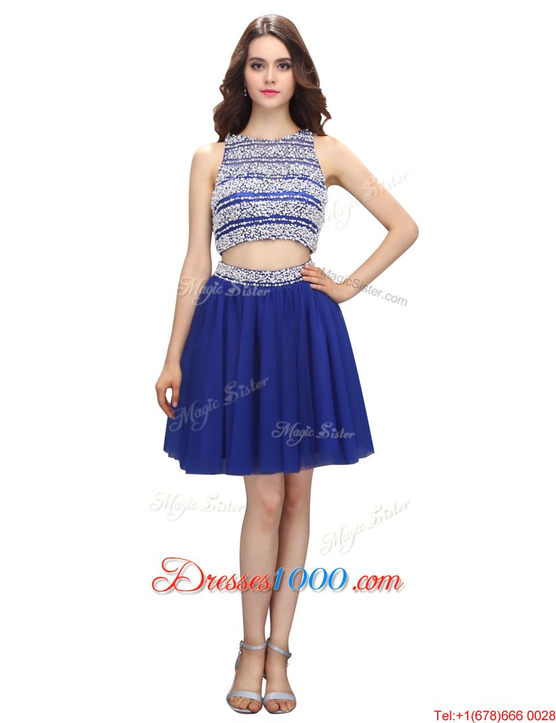 Scoop Royal Blue Sleeveless Knee Length Beading Backless