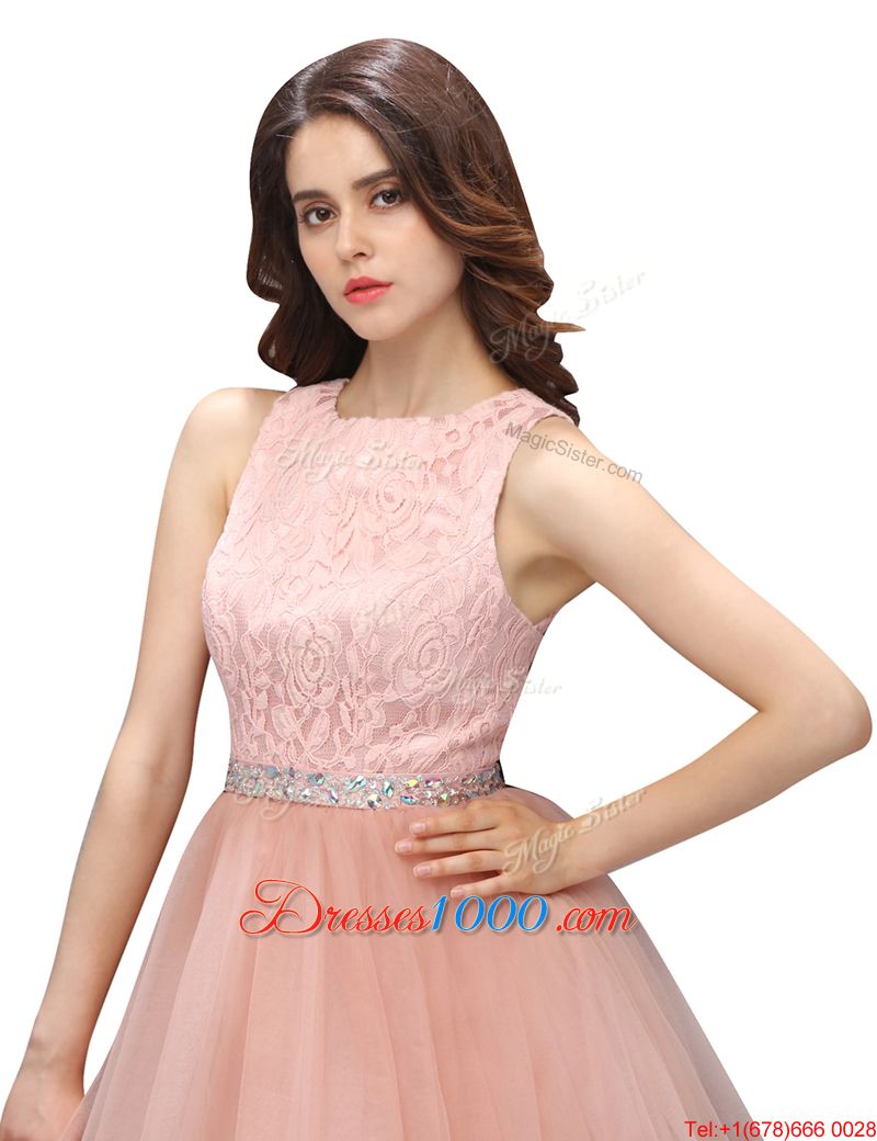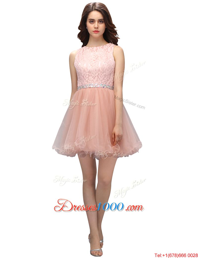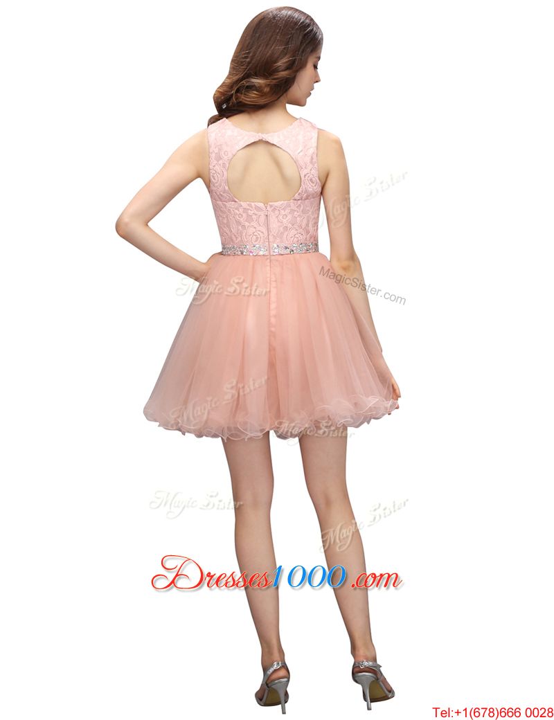 Dramatic Scoop Pink Zipper Beading and Lace Sleeveless Mini Length