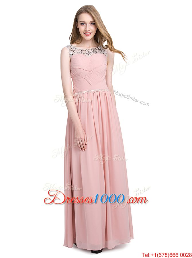 Glorious Scoop Sleeveless Homecoming Party Dress Floor Length Beading Pink Chiffon
