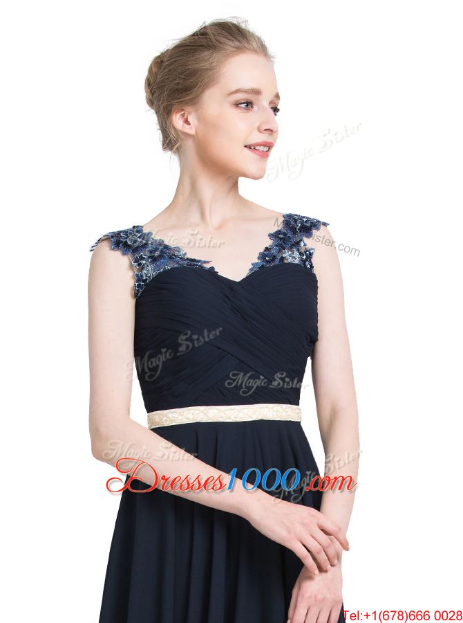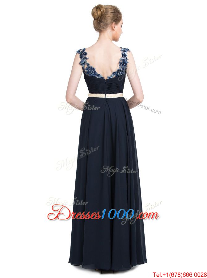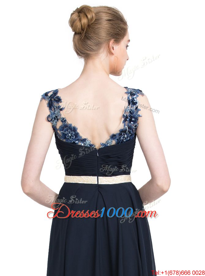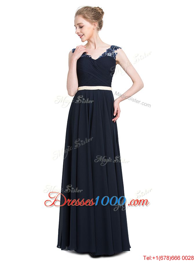 Sleeveless Chiffon Floor Length Zipper Dress for Prom in Navy Blue for with Beading
