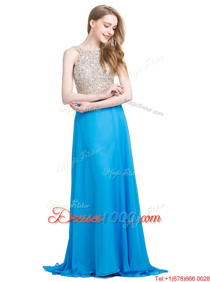 Excellent Scoop With Train Column/Sheath Sleeveless Blue Evening Dresses Brush Train Zipper