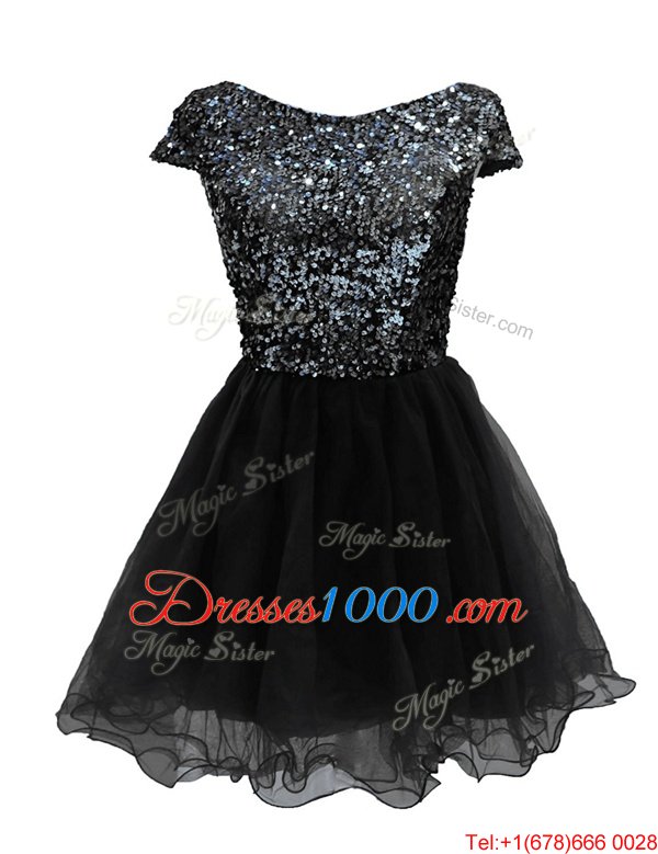 Black Evening Party Dresses Prom and Party and For with Sequins Bateau Cap Sleeves Zipper