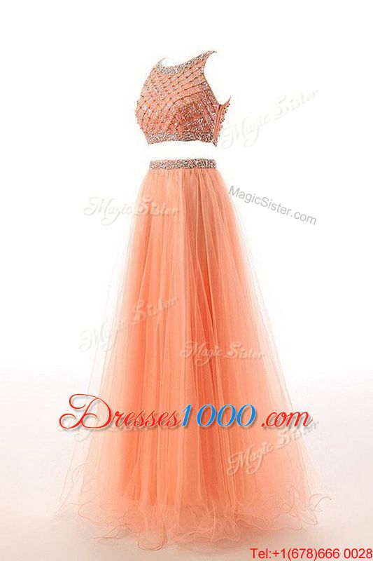 Classical Orange A-line Organza Scoop Sleeveless Beading and Belt Side Zipper Juniors Evening Dress Sweep Train