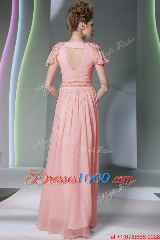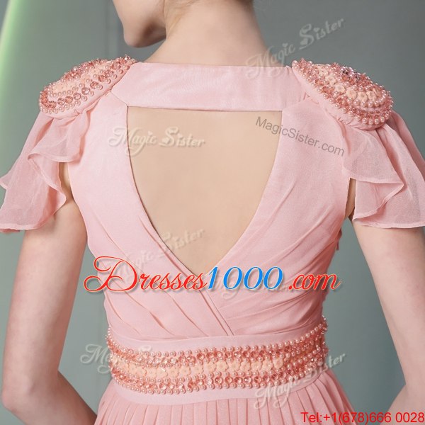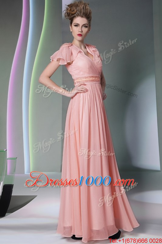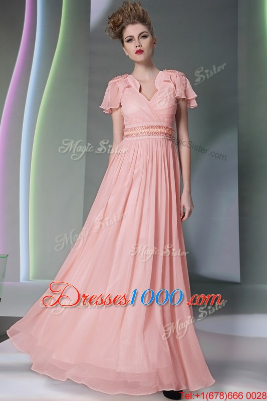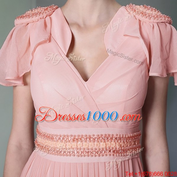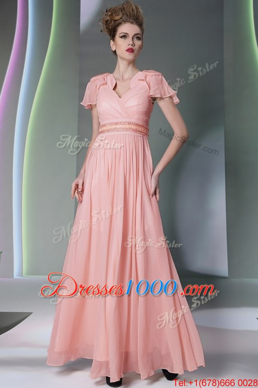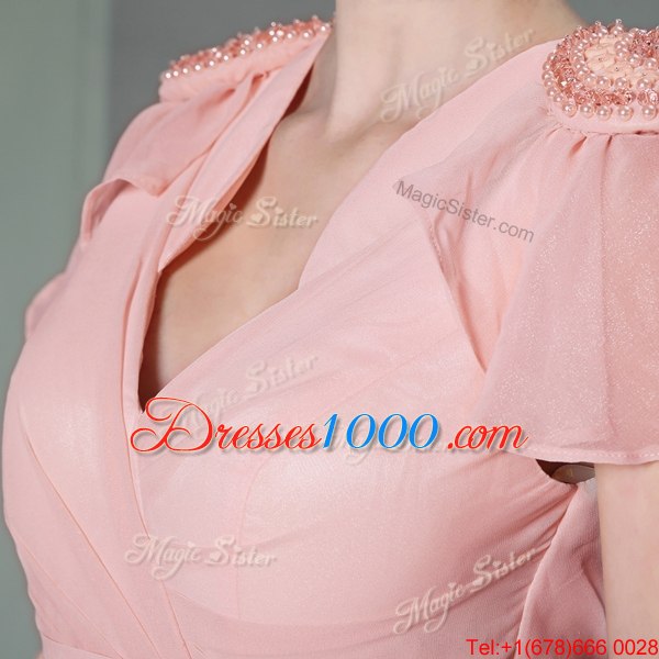 Admirable Pink V-neck Side Zipper Beading and Ruching Cap Sleeves