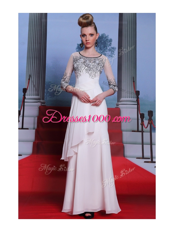 Scoop 3|4 Length Sleeve Chiffon Floor Length Zipper Dress for Prom in White for with Beading and Appliques
