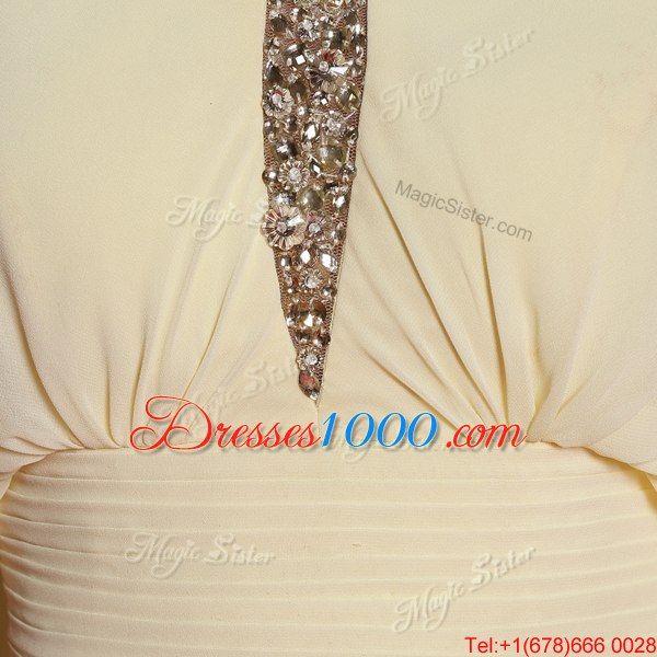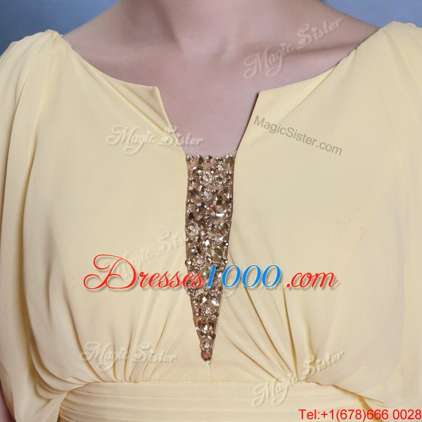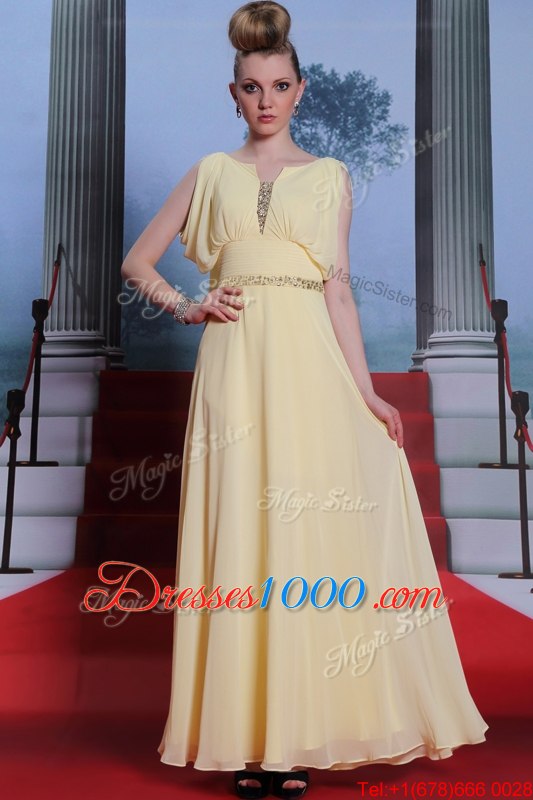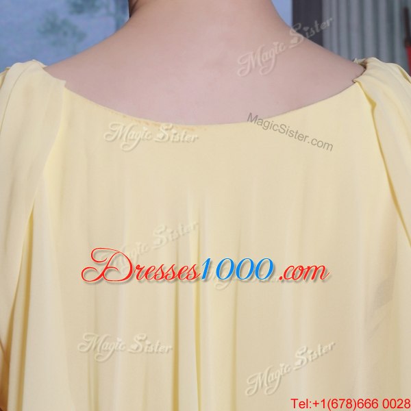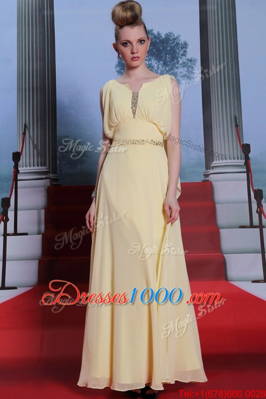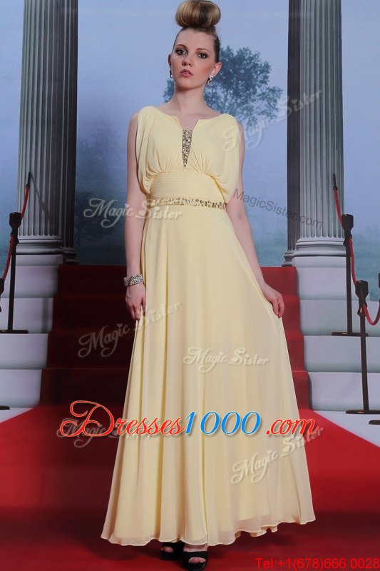 Scoop Sleeveless Chiffon Floor Length Side Zipper Prom Evening Gown in Light Yellow for with Beading