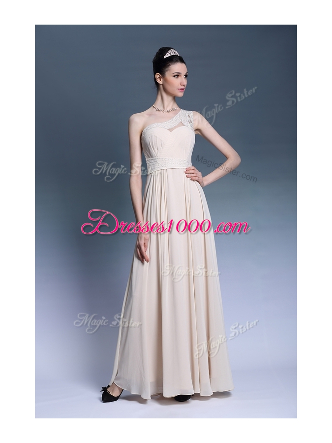 Hot Sale Champagne Chiffon Side Zipper One Shoulder Sleeveless Floor Length Beading and Ruching