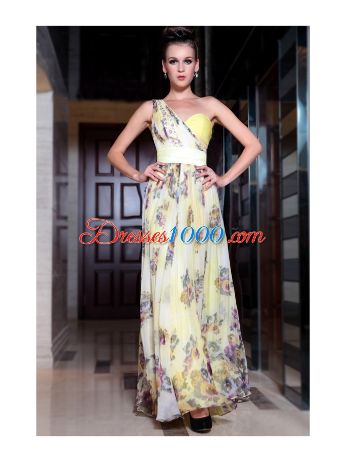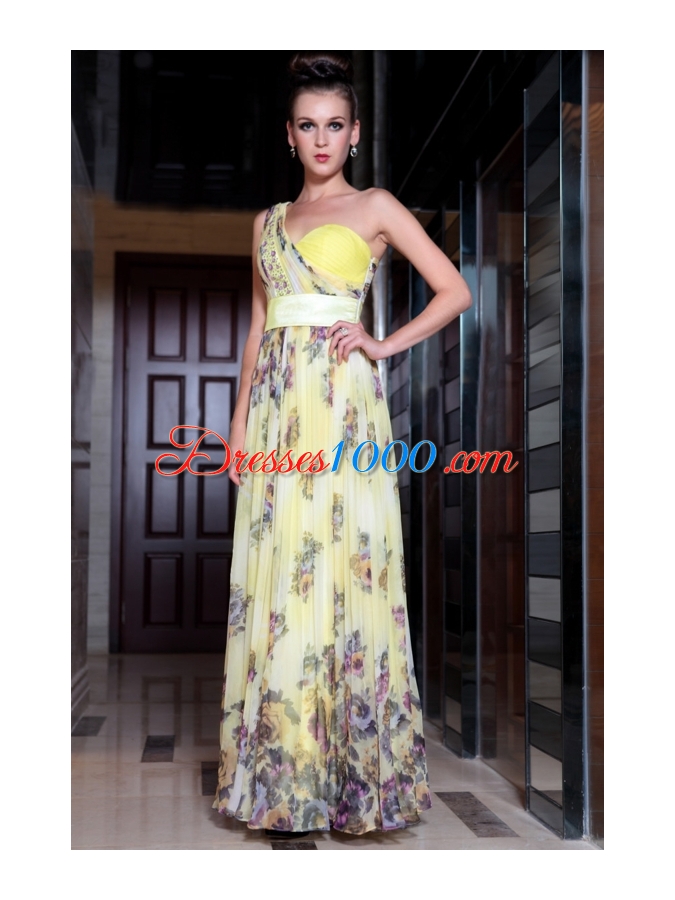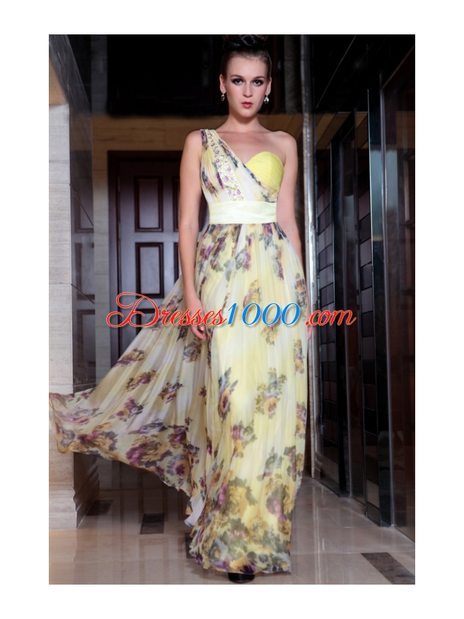 Amazing Light Yellow Column/Sheath One Shoulder Sleeveless Chiffon Floor Length Side Zipper Beading and Pattern Prom Gown