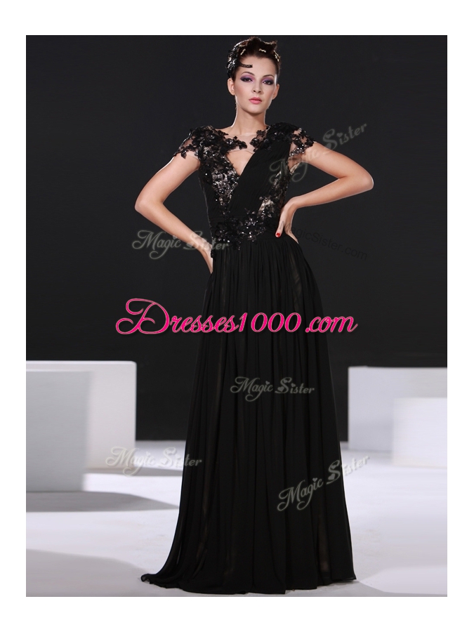 Fabulous Floor Length Black Prom Gown Scoop Cap Sleeves Backless