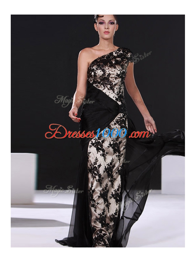 One Shoulder Black Cap Sleeves Chiffon Brush Train Side Zipper Prom Dress for Prom and Party