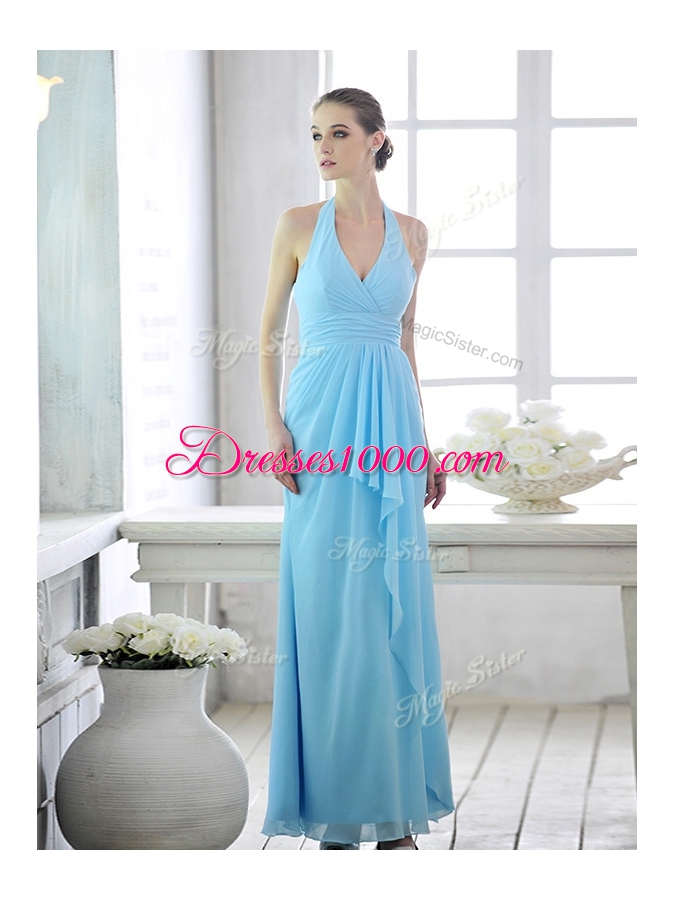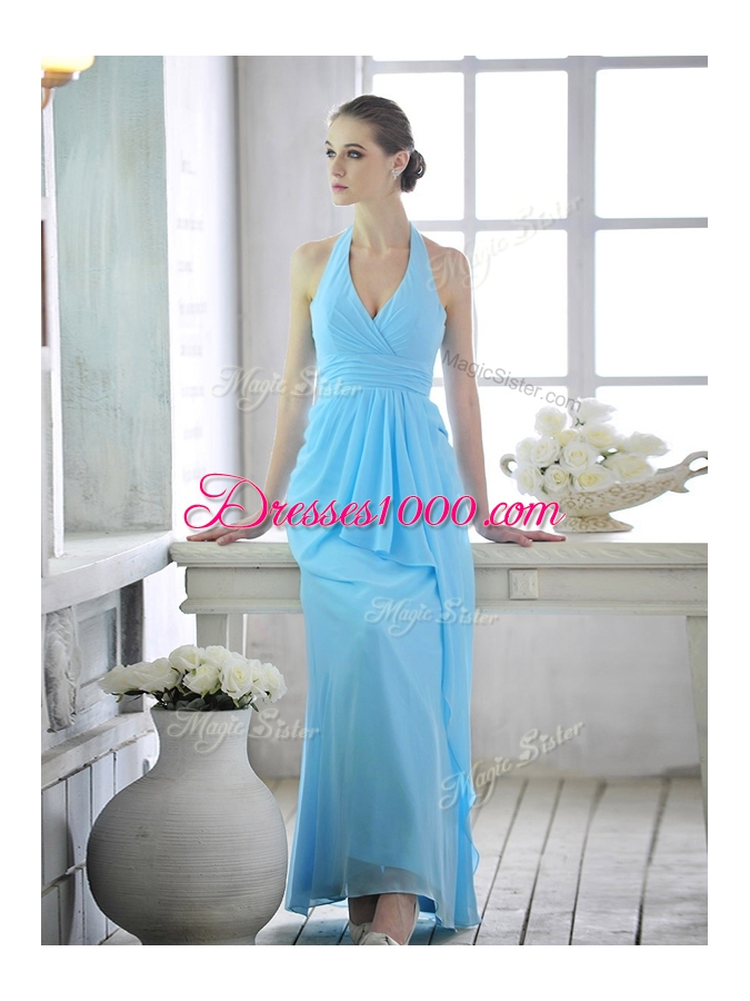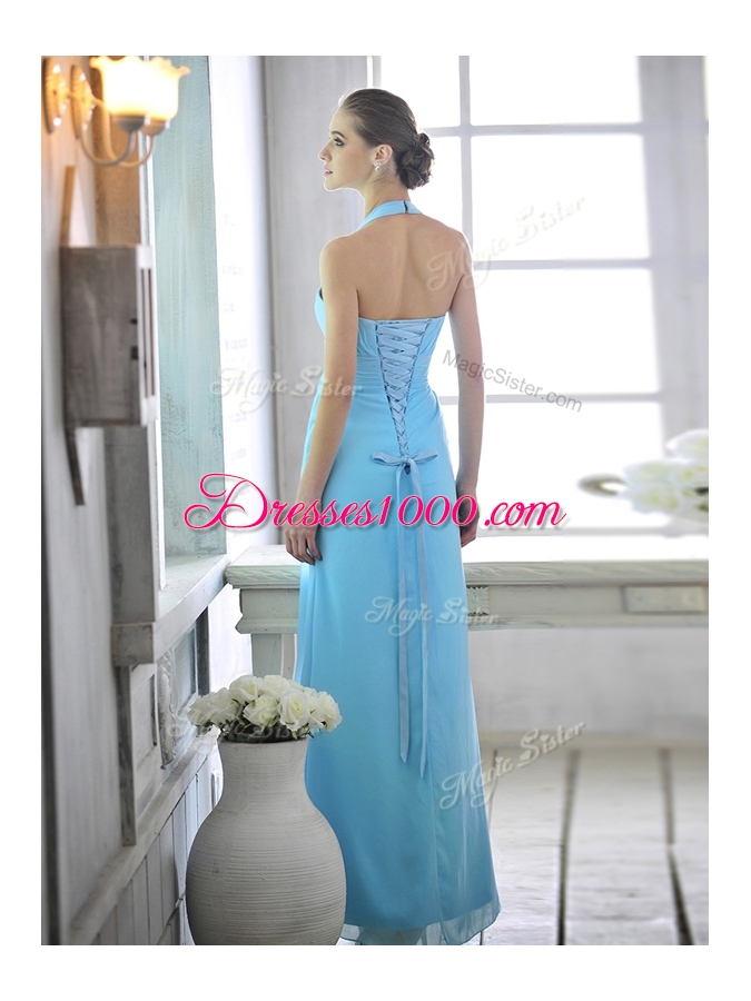 Beauteous Baby Blue Column/Sheath Chiffon Halter Top Sleeveless Ruffles and Ruching Ankle Length Lace Up Homecoming Dress Online