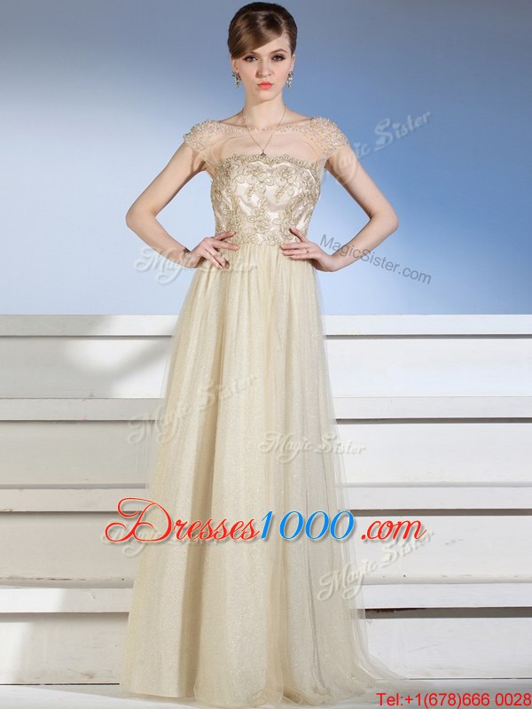 Gorgeous Champagne Column/Sheath Appliques Formal Evening Gowns Side Zipper Chiffon and Tulle Sleeveless Floor Length
