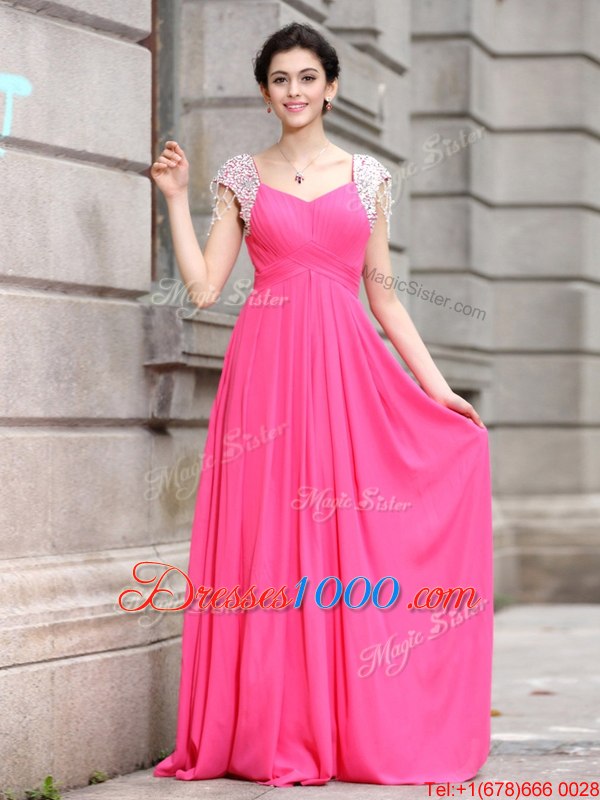 Custom Fit Hot Pink Cap Sleeves Floor Length Beading Zipper Prom Gown