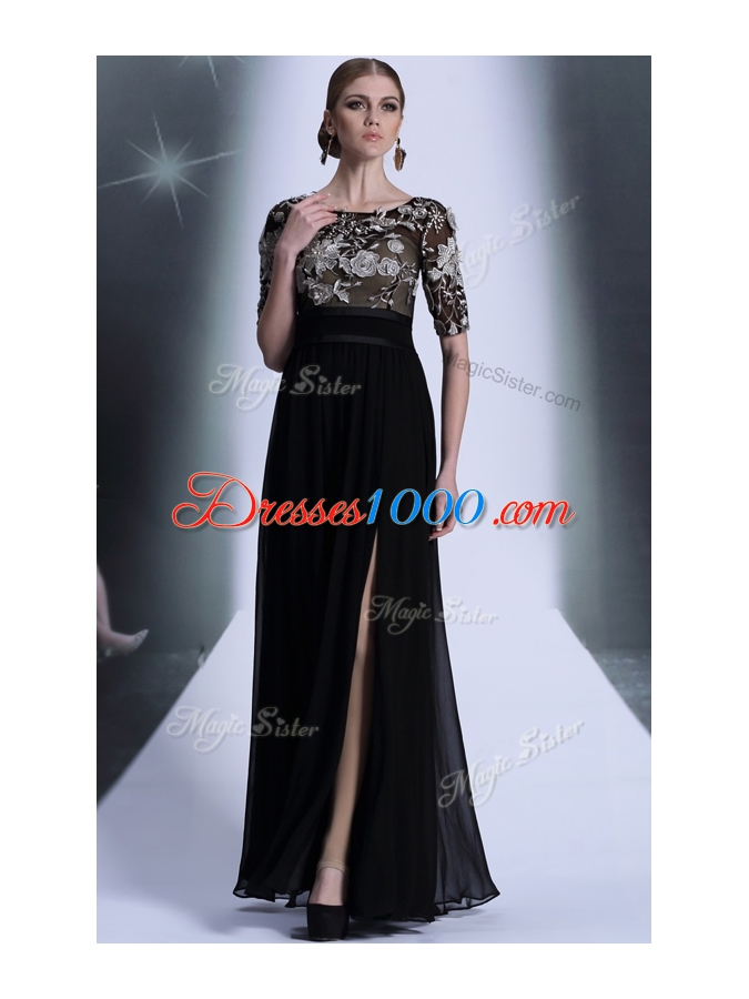 Customized Scoop Floor Length Black Evening Dress Chiffon Half Sleeves Beading and Appliques