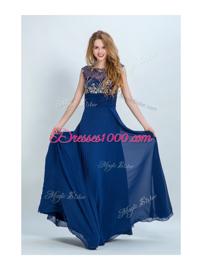 Elegant Floor Length Navy Blue Evening Wear Scoop Sleeveless Zipper