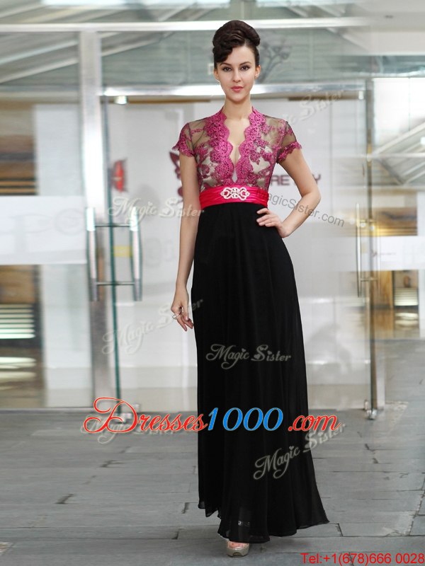 Hot Sale Red And Black V-neck Neckline Appliques and Ruching Prom Evening Gown Short Sleeves Zipper