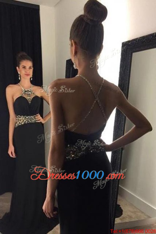 Brush Train Mermaid Homecoming Gowns Black Halter Top Satin Sleeveless With Train Criss Cross