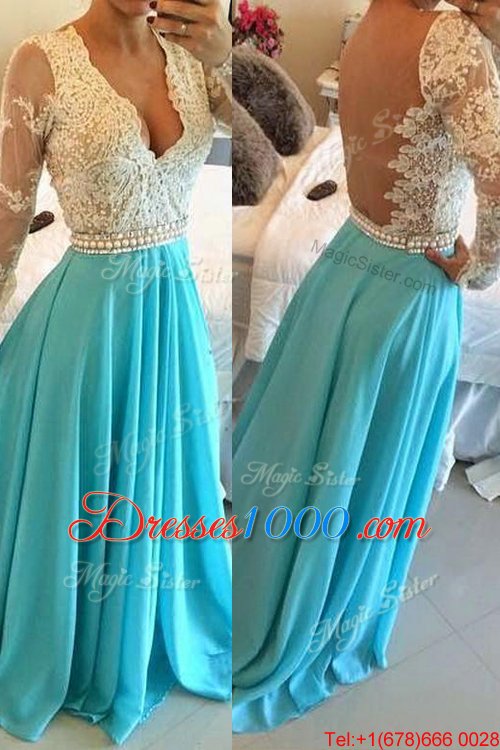 Baby Blue A-line Lace Going Out Dresses Backless Chiffon Long Sleeves Floor Length
