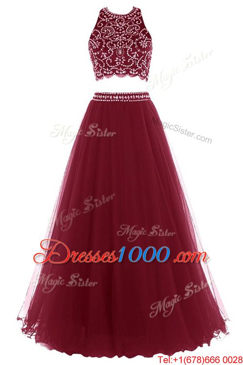 Elegant Halter Top Burgundy Sleeveless Tulle Zipper Evening Outfits for Prom and Party
