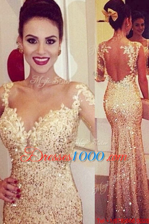 Fantastic Mermaid Lace and Appliques and Sequins Prom Dress Gold Backless Long Sleeves Floor Length