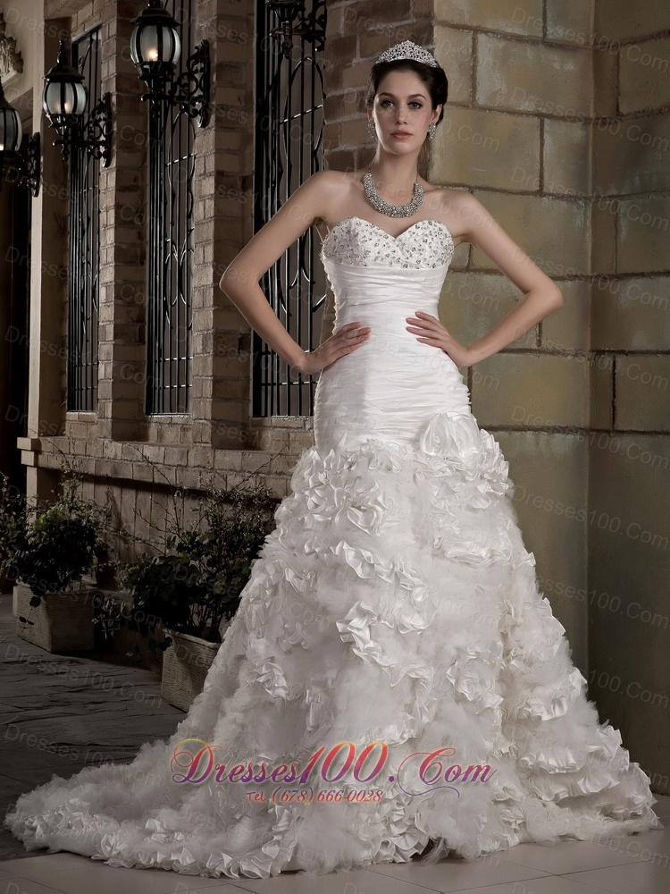Gorgeous and fantastic wedding gown dress! Sweetheart fitted bodice is ruched with the bust area stoned with sparckle crystals. Ruffles on the skirt which also extends to the back to be a sweeping train will strick your eyes! The hidden zipper on the back allows easy off and on. Be elegant with this beautiful dress on!